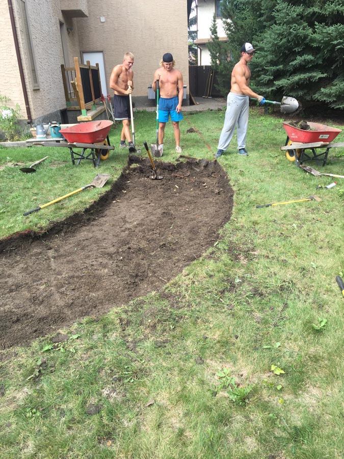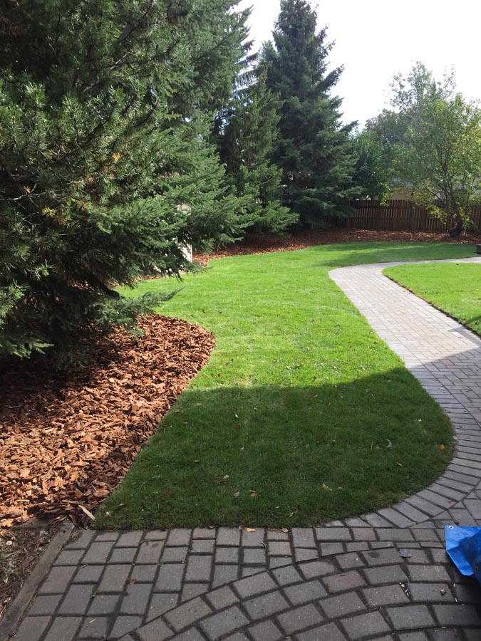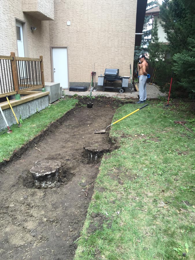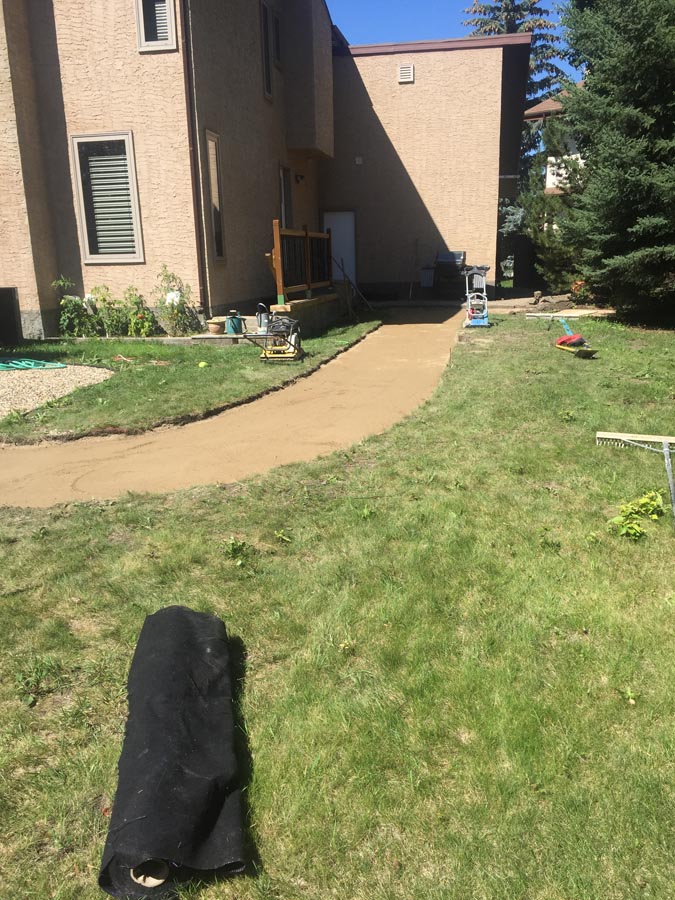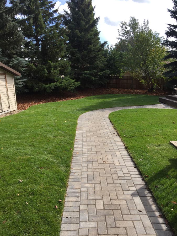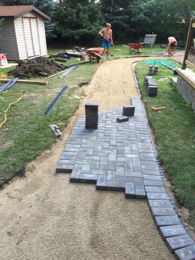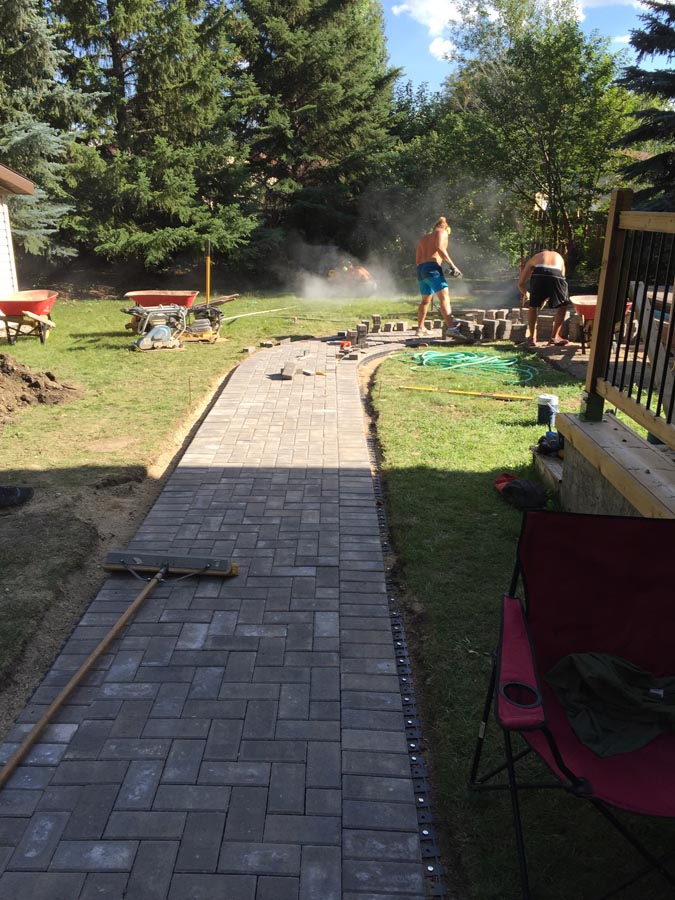 A front to back patio stone walkway to deck.